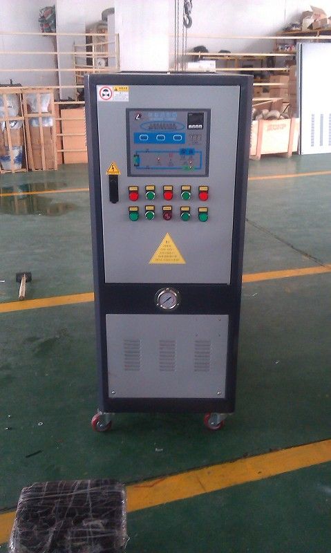 油溫機(jī)實(shí)質(zhì)上是指利用導(dǎo)熱油做為傳熱媒介來進(jìn)行加熱控溫的模溫機(jī).油溫機(jī)自帶膨脹油箱,膨脹油箱有三大作用:補(bǔ)油、排氣及容納導(dǎo)熱油經(jīng)過高溫之后的膨脹系數(shù),在正常升溫過程中,油箱是不參與加熱過程的,高溫油溫機(jī)在使用初期,導(dǎo)熱油經(jīng)膨脹油箱補(bǔ)充進(jìn)入管路系統(tǒng),經(jīng)高溫泵強(qiáng)制液相循環(huán),在需控溫的設(shè)備與機(jī)組系統(tǒng)之間循環(huán),導(dǎo)熱油從機(jī)組的發(fā)熱裝置出來后,溫度升高,進(jìn)入控溫設(shè)備后,熱量被吸收,再返回到系統(tǒng)的發(fā)熱管中繼續(xù)升溫,在此泵泵注入到需用熱設(shè)備中,周而復(fù)始,直至用熱設(shè)備達(dá)到設(shè)定溫度.