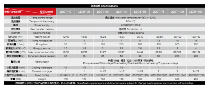 LEOT模溫機屬于高溫油溫機系列,由于采用更先進的控制工藝以及配件,機組的控制溫度可以達到350℃,可以被應用在眾多工業(yè)設備控溫場合,例如橡膠硫化、烘房控溫、模具控溫、輥輪控溫、發(fā)泡控溫等。其控制溫度可分為300℃/350℃,加熱功率3KW-1200KW可選擇,在選擇時主要依據(jù)加熱功率,泵浦性能,冷卻能力等這幾方面,在選購模溫機時,盡量提供詳細的工藝情況給生產(chǎn)廠家,根據(jù)需要實際生產(chǎn)工藝來確定加熱功率及泵浦功率,,避免油溫機出現(xiàn)功率過大或不足的現(xiàn)象產(chǎn)生。