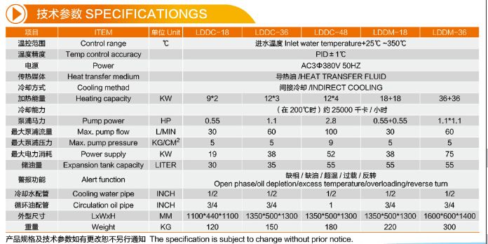 在出廠前均進(jìn)行嚴(yán)格的測試,以產(chǎn)品的技術(shù)、質(zhì)量可靠。設(shè)有多項(xiàng)保護(hù)設(shè)置,溫度異常時,循環(huán)溫度上限值警報(bào)并切斷主電源,接觸器卡死異常加熱報(bào)警并指示,系統(tǒng)壓力異常自動停止加熱動作,BY-PASS泄壓回路保護(hù)泵浦,液位開關(guān)檢測油位防止缺油并報(bào)警指示,保護(hù)故障顯示,維修保養(yǎng)無須人員。