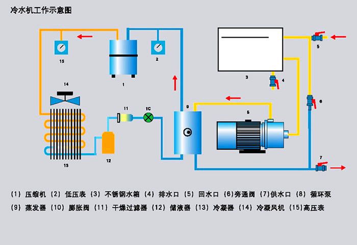 2、微電腦控制系統(tǒng)及觸摸式操作面板:操作面板上裝有電流表,控制系統(tǒng)保險,壓縮機及水泵開關按鈕,電子溫控制器,各保護故障燈,示冷水出口、冷水入口和設定溫度選配,機組啟動運轉(zhuǎn)指示燈,使用方便。