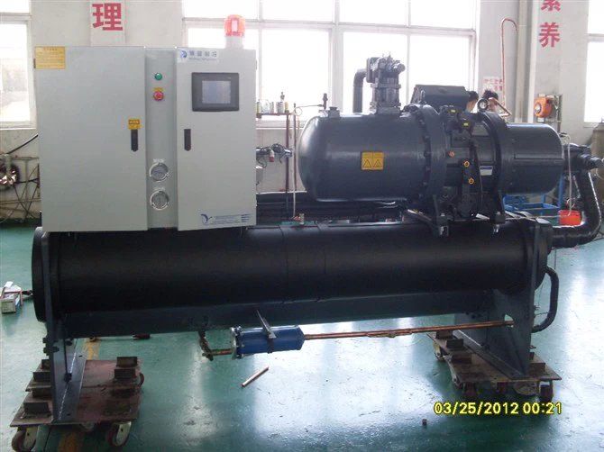 水冷式冷水機(jī)是通過循環(huán)冷卻水來帶走熱量的,其原理是利用殼管蒸發(fā)器使水與冷媒進(jìn)行熱交換的,由冷媒系統(tǒng)吸收水中的熱負(fù)荷,來使水降溫再產(chǎn)生冷水,通過壓縮機(jī)的作用將熱量帶到殼管式冷凝器,讓冷媒與水進(jìn)行熱交換,使水吸收熱量后,然后再通過壓縮機(jī)的作用將熱量帶出外部的冷卻塔散失(也就是水冷卻).