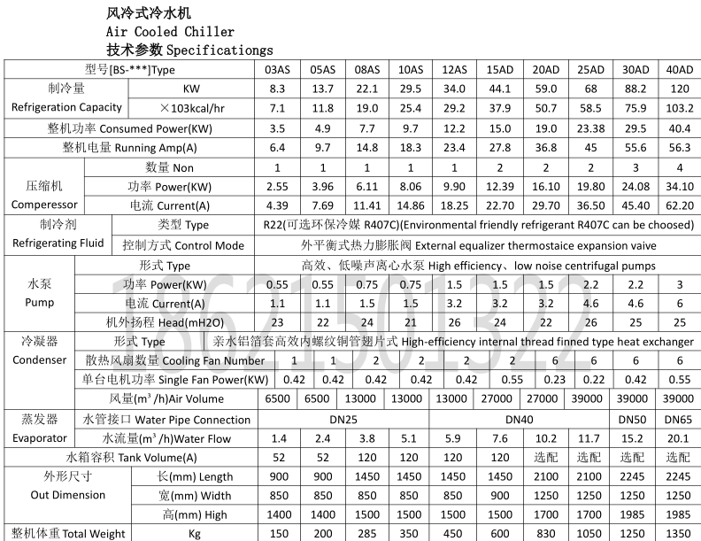 工業(yè)冷水機(jī)組按制冷形式一般可分為水冷型冷水機(jī)組和風(fēng)冷型冷水機(jī)組,在技術(shù)上,水冷比風(fēng)冷能效比要高出300到500的kcal/h,在價格上,水冷要比風(fēng)冷低得多,在安裝上,水冷需納入冷卻塔方可使用,風(fēng)冷則是可移動,無需其他輔助,但風(fēng)冷式冷水機(jī)只憑風(fēng)扇散熱,對環(huán)境有所要求,例如通風(fēng),濕度,溫度不能高40°C.